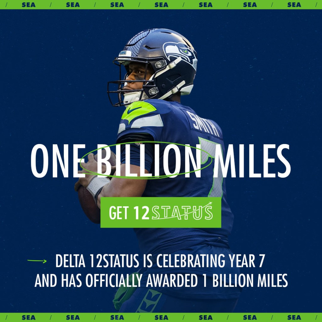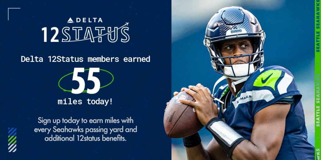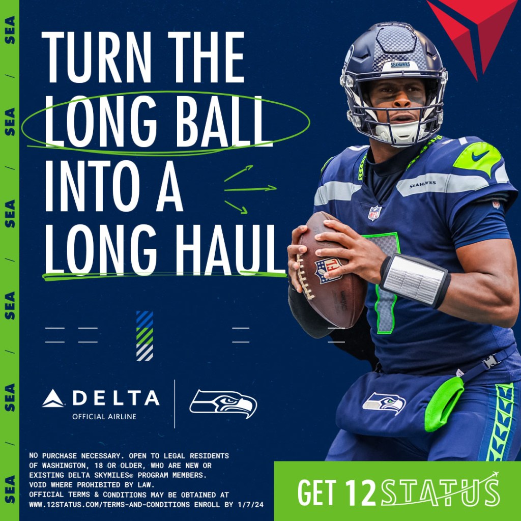 With Delta 12Status, Seahawks fans based in the Seattle area were able to earn miles with every passing yard made by Geno Smith: this year’s ambassador for the program. Through a variety of Paid, Email, and Organic Social assets, we were able to reach our campaign goal of 100,000 sign-ups.