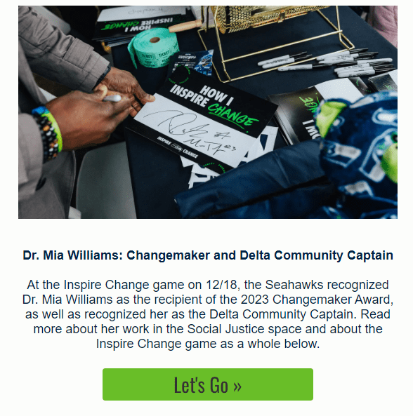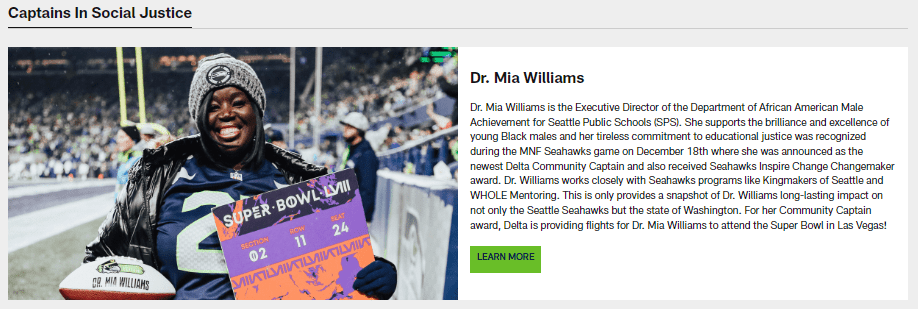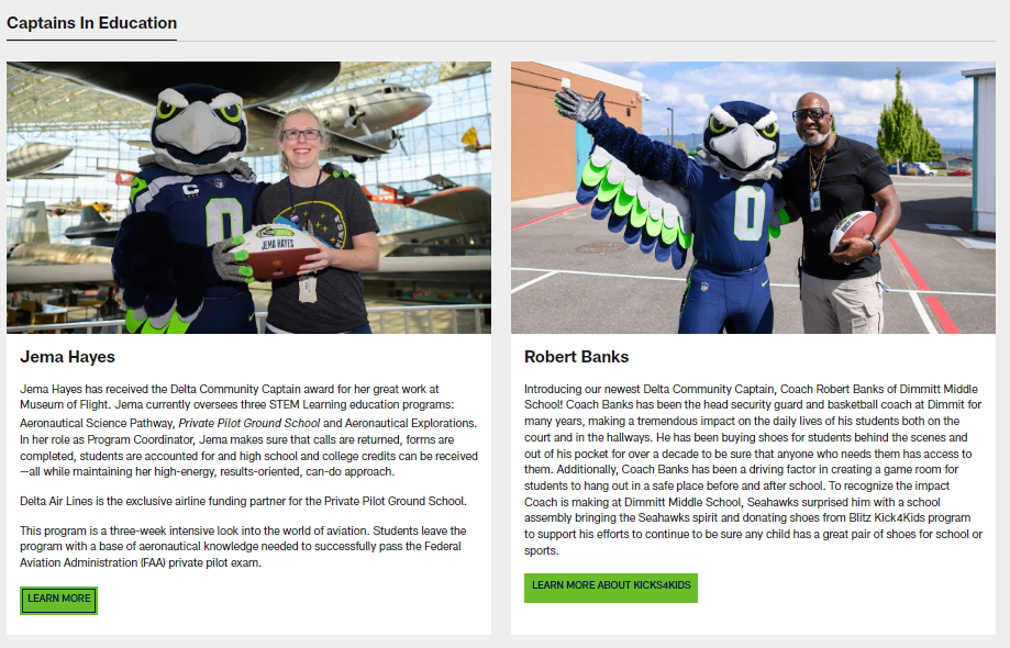 Delta Community Captain, a collaboration between the Seahawks and Delta Airlines, is a program where individuals within the Seattle community are recognized for their endeavors falling into four areas that align with our team values: Social Justice, Education, Military, and Environment.