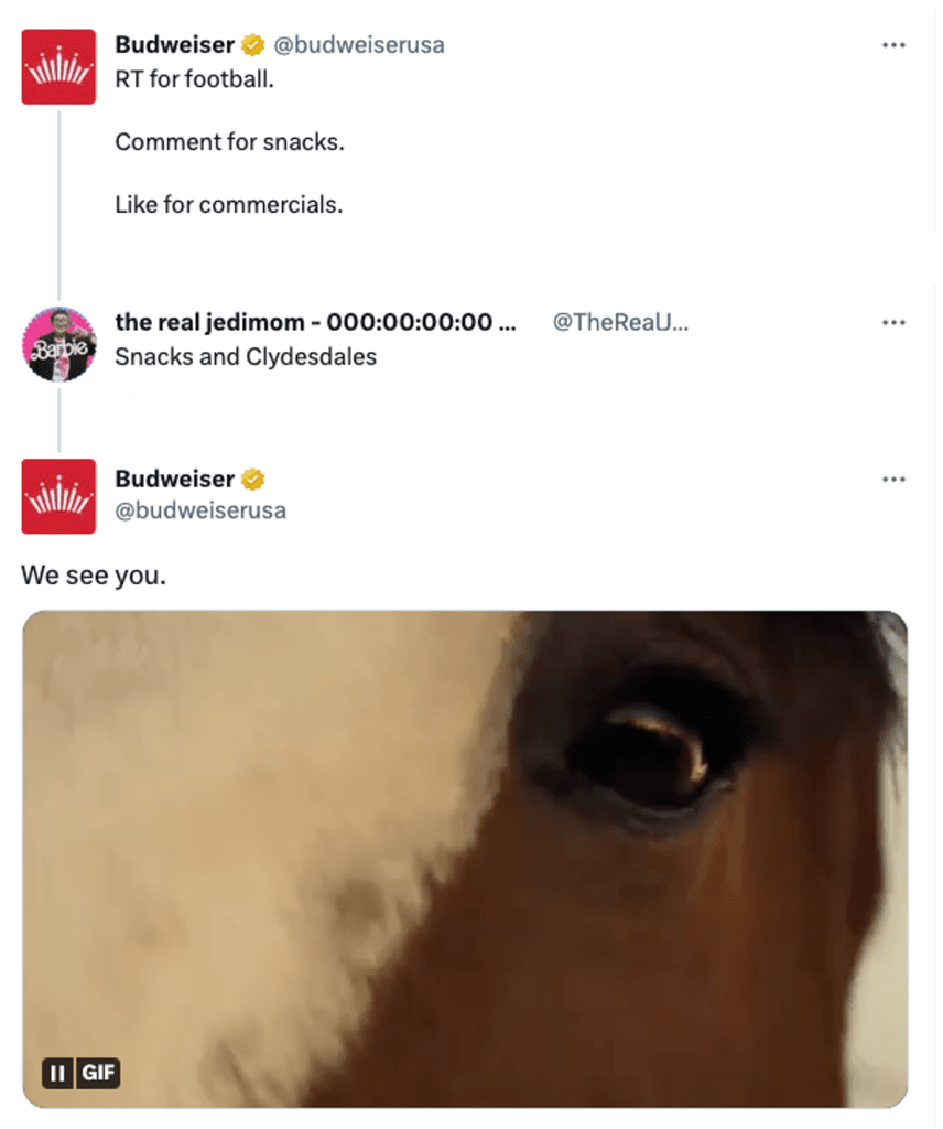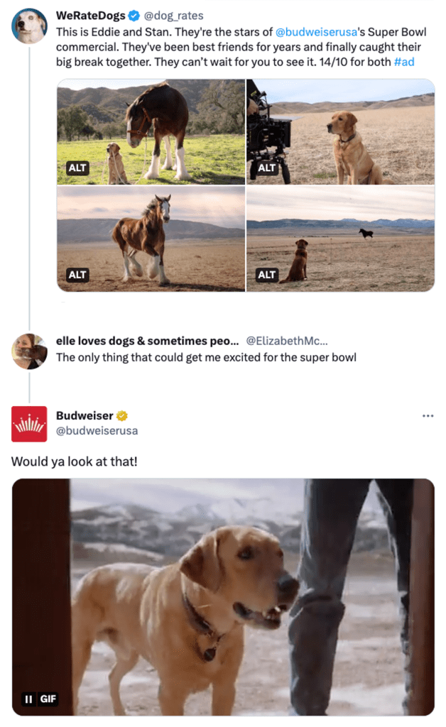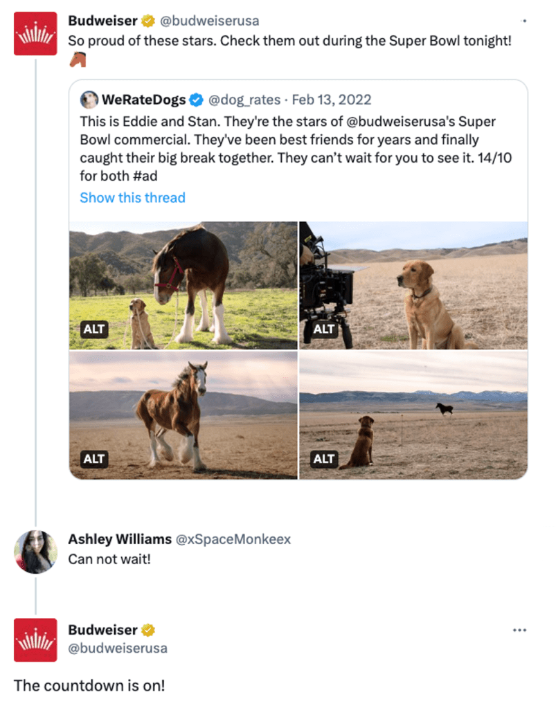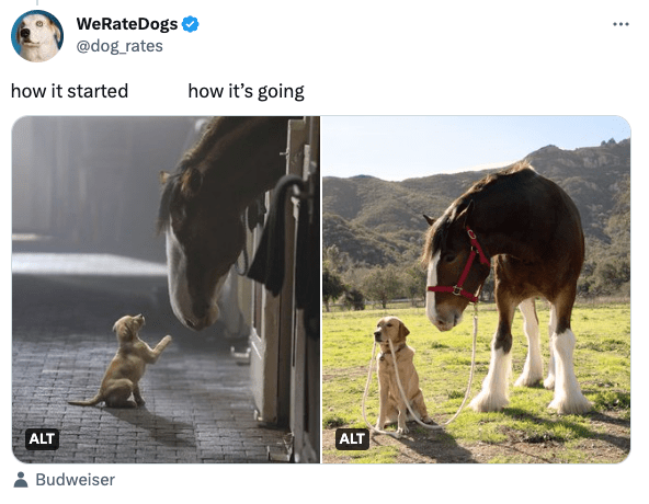 The sentiment behind the commercial was to remind America that the country would come back stronger than ever in a post-pandemic environment. The commercial, shot by Yellowstone director Chloe Zhao, depicted a Clydesdale on its healing journey. Budweiser also partnered with viral Twitter account We Rate Dogs in a farse stunt, joking that the Clydesdale featured alongside the dog in the commercial was, indeed, also a dog.