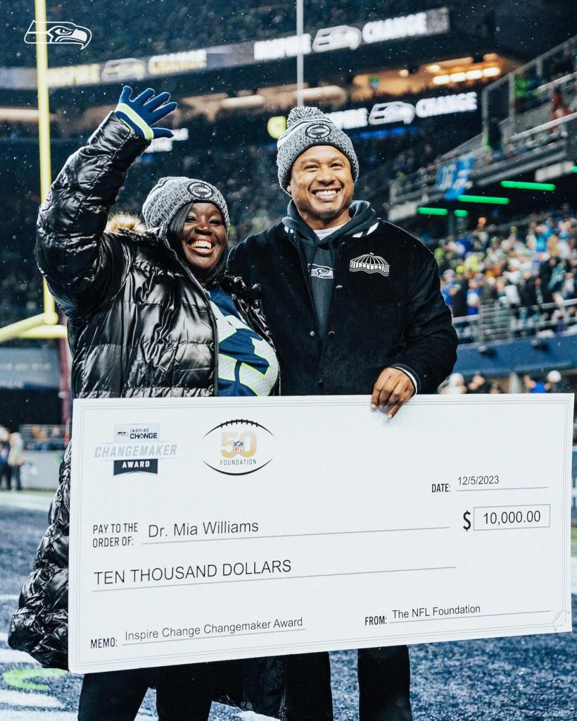 The Seahawks’ primary priority was to promote the announcement of Dr. Mia Williams as their 2023 Changemaker: highlighting her work as the Executive Director of the Department of African American Male Achievement for Seattle Public Schools. Not only did we present her with a $10K check donation, but we surprised her with tickets to Super Bowl LVIII during her on-field recognition.
