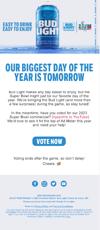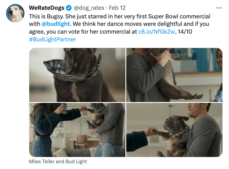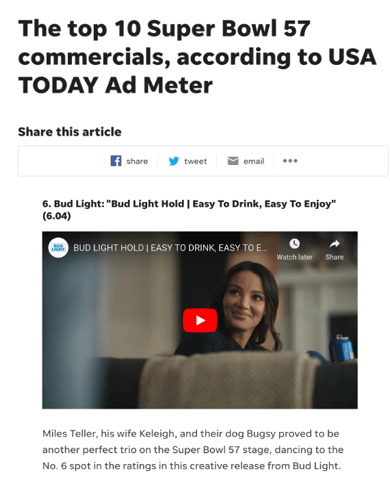 Bud Light also partnered with meme accounts via Doing Things Media. For extra amplification, the brand asked consumers to vote their spot #1 on USA Today’s “Ad Meter” by releasing email blasts and recruiting Teller fandom accounts. The spot won #6 overall.