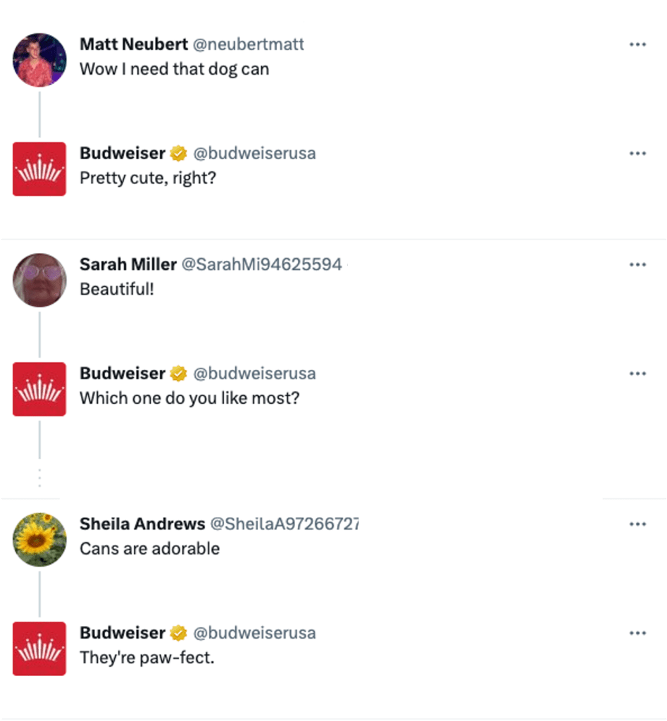 Budweiser’s social channels participated in 1:1 engagement with consumers – uploading submitted entries onto the can in real-time and pairing them with a clever response.