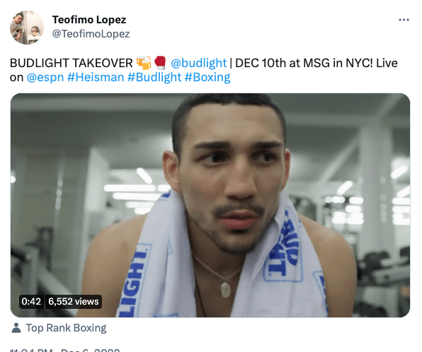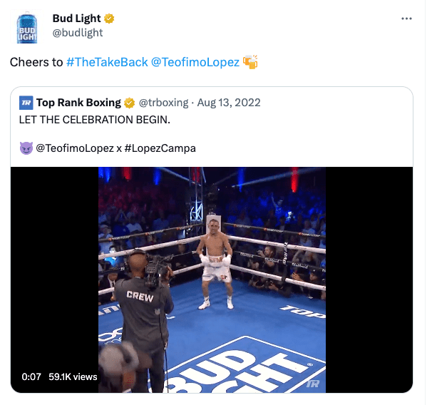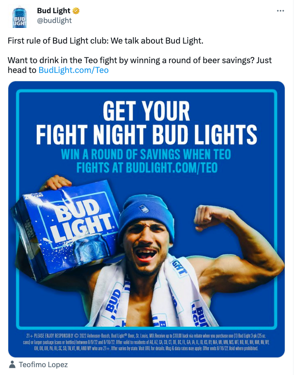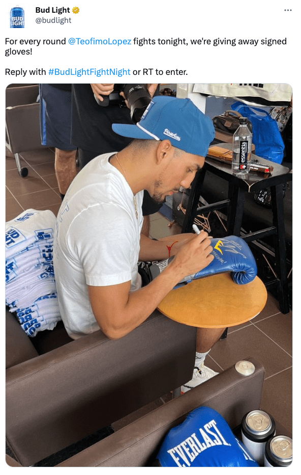 Post-airing, Bud Light held various social giveaways during Teo’s fights, asking fans to cheer him on for a chance to win signed gloves.